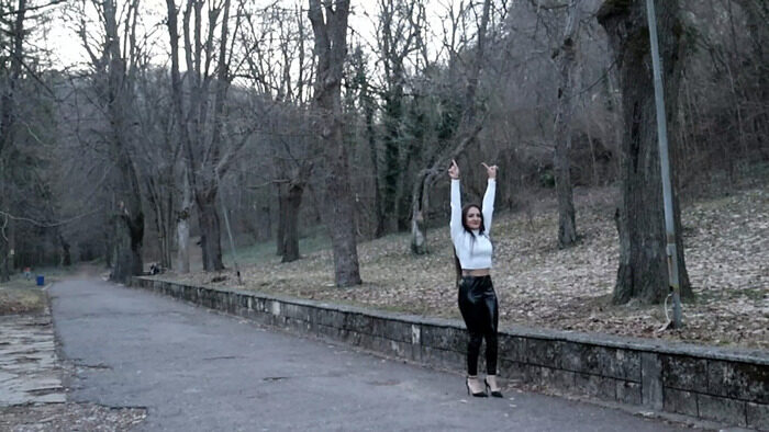 L:y stands among the trees, the forest floor soft beneath her heels, fallen leaves crunching quietly with every small movement. Her shiny black wetlook leggings catch the dappled sunlight breaking through the canopy, giving her an otherworldly glow. She checks her phone. No message yet. No problem. She shifts her weight from one heel to the other, crosses a leg, uncrosses it again, and gives the world a look that says, “Marc R. is late, but style survives even in the wild.”