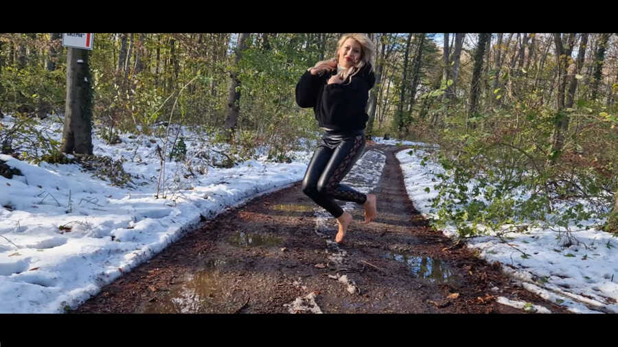 There are walks in the forest… and then there’s Yo’s forest adventure the kind that turns snow, mud, and high heels into a playful runway. Dressed in shiny wet-look leggings that caught every glimmer of winter light, she stepped onto the snowy trail like a mix between a fashion model and a mischief-maker ready to test the limits of nature and style.